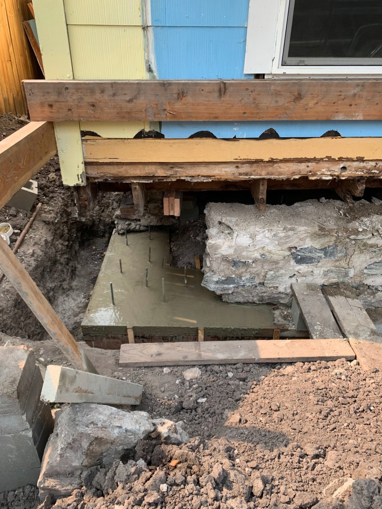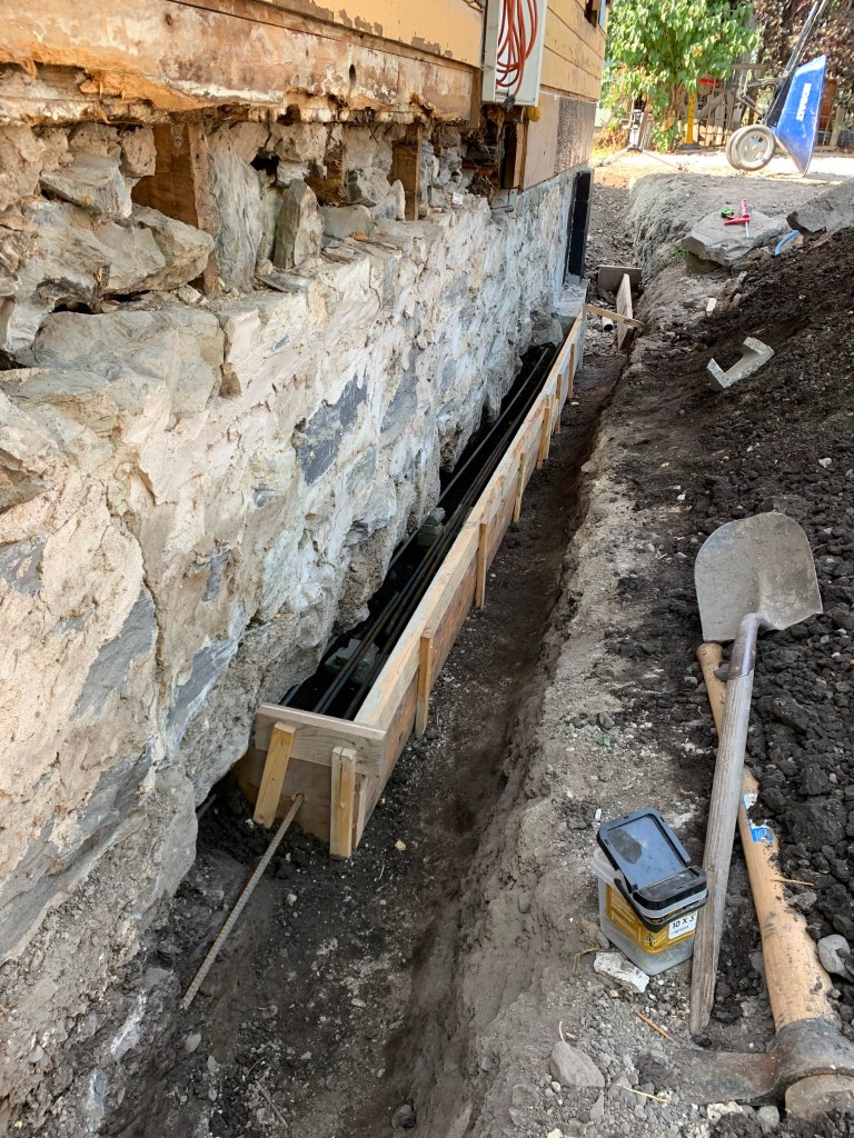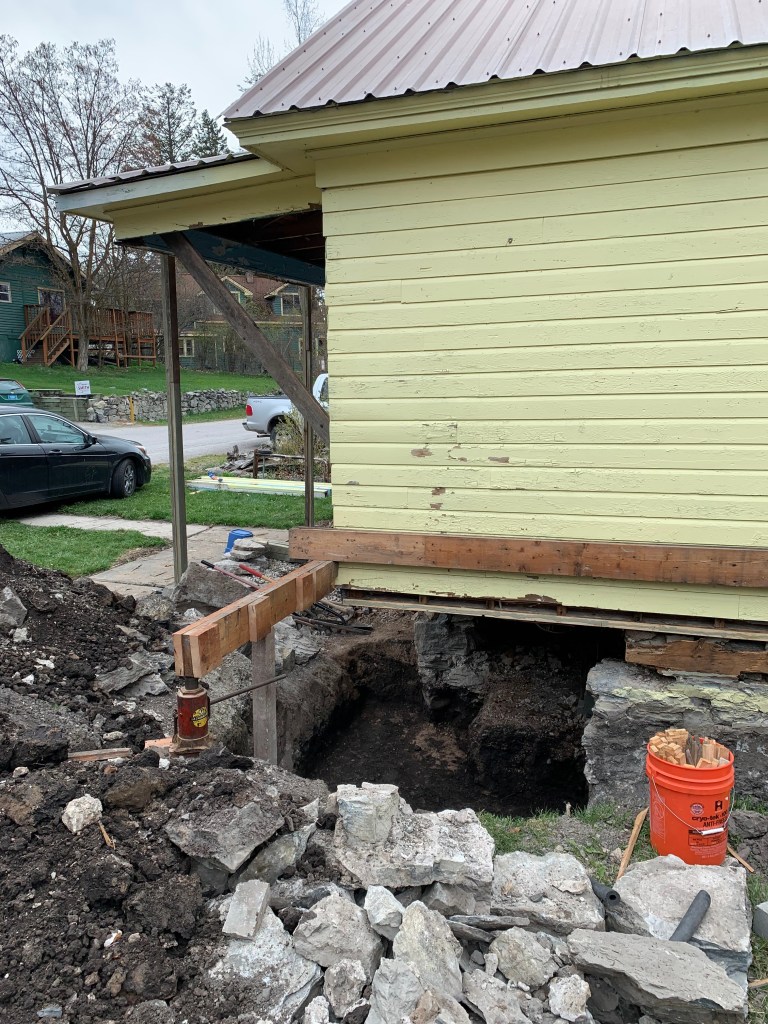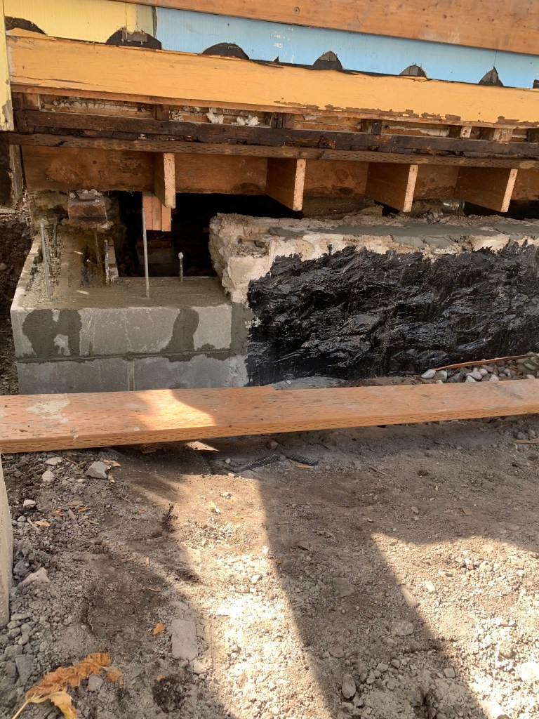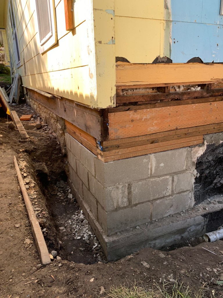 A favorite project. Our intrepid homeowner wanted to lift the front of their house and redo the front end of the home’s foundation. The home sits at the bottom confluence of three intersecting hills. A dry well and full french drain was included. After lifting the home 6+ inches, the eroded corners of the original rubble foundation were removed and replaced with crazy solid masonry. The foundation was waterproofed. We replaced the original water line in the process, and a period appropriate deck was added.